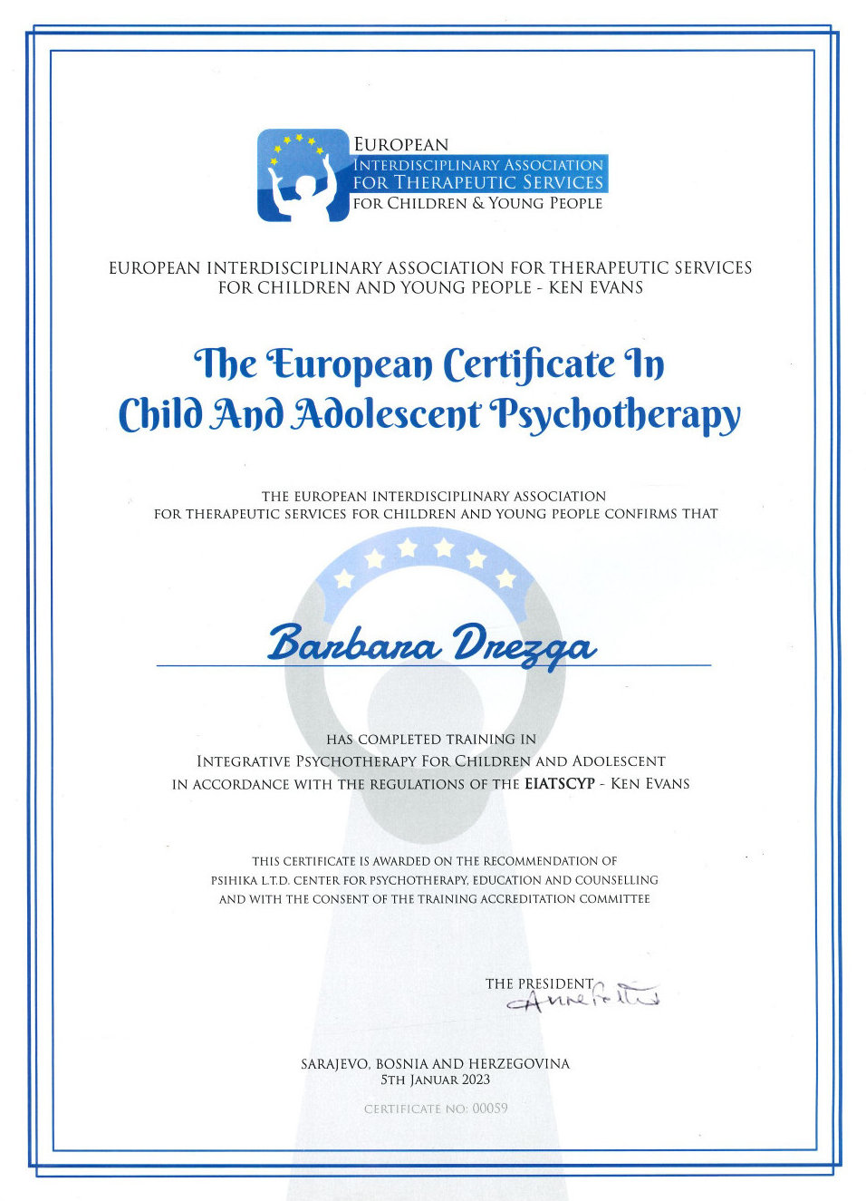 Našu stručnost potvrđuje i "Europski certifikat za dječju i adolescentsku psihoterapiju". Certifikat možete vidjeti ovdje